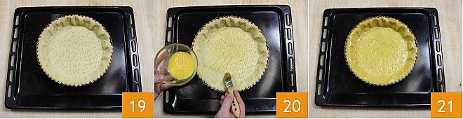 Nehmen Sie den Boden aus dem Ofen 19 und bestreichen Sie ihn mit dem geschlagenen Ei auf dem Boden, um die Füllung zu isolieren (20-21), backen Sie ihn für ein paar Minuten in einem heißen Ofen, damit das Ei eine isolierende Schicht bildet. Nun ist Ihr Boden bereit, mit Pudding oder Marmelade gefüllt zu werden!