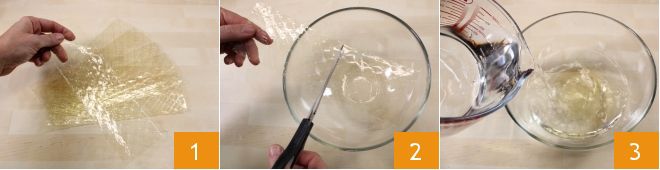 Sehen wir, wie man den Fischkleber verwendet. Der Fischkleber wird in durchsichtigen Blättern geliefert, die unterschiedliche Gewichte haben können 1. Bevor man sie verwendet, muss sie mit kaltem Wasser rehydriert werden: Also nehmen wir unser Blatt und schneiden es so zu, dass wir es vollständig 2 in eine Schüssel eintauchen können und kaltes Wasser darüber gießen 3,
