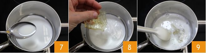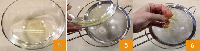 wo es etwa 10 Minuten lang einweichen wird 4. Es gibt auch Fischkleber in Pulverform, die diese Behandlung nicht benötigt, sondern direkt in der Zubereitung verwendet wird. Wenn die Gelatineblätter gut weich sind, lassen Sie sie in einem feinen Sieb abtropfen 5, um zu vermeiden, dass Teile davon im Wasser verloren gehen. Schließlich drücken Sie sie vorsichtig mit den Händen aus 6.