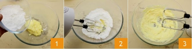Um die Wiener Doppelschokoladen-Kekse zuzubereiten, schlagen Sie die Butter mit dem Puderzucker mit einem elektrischen Handrührgerät (1-2), bis Sie eine schaumige Masse erhalten 3.