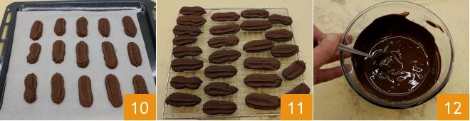 dann fügen Sie die Milch hinzu 7 und mischen weiter; Sie sollten einen Teig erhalten, der weder zu hart noch zu flüssig ist, mit einer buttrigen Konsistenz. Geben Sie es in einen Spritzbeutel mit einer ziemlich breiten Sterntülle 8; legen Sie ein Backpapier auf ein Backblech und beginnen Sie, 5-6 cm lange Kekse zu formen 9,