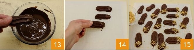 tauchen Sie ein Ende jedes Kekses in die Schokolade 13 und legen Sie sie auf ein Tablett, das mit Backpapier ausgelegt ist 14; bestreuen Sie dann jeden Keks mit Krokant über dem Teil mit der geschmolzenen Schokolade 15. Lassen Sie die geschmolzene Schokolade bei Raumtemperatur fest werden und Ihre Wiener Doppelschokoladen-Kekse sind bereit zum Servieren!