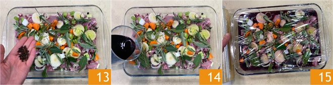 Fügen Sie auch die Gewürznelken hinzu 13, dann gießen Sie den Rotwein 14 ein und decken Sie mit Folie ab 15. Lassen Sie es weitere 24 Stunden im Kühlschrank marinieren.