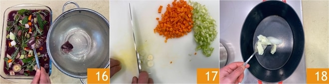 Nach dieser Zeit bereiten Sie die Gemüsebrühe vor und halten Sie sie warm. Nehmen Sie dann das Fleisch aus der Marinade, lassen Sie es in einem Sieb abtropfen 16 und entfernen Sie das Gemüse. Schälen und würfeln Sie die Karotte und den Sellerie, dann schneiden Sie die Frühlingszwiebel in feine Scheiben 17. Lassen Sie in einem Schmortopf das Schmalz mit der Butter langsam schmelzen 18.