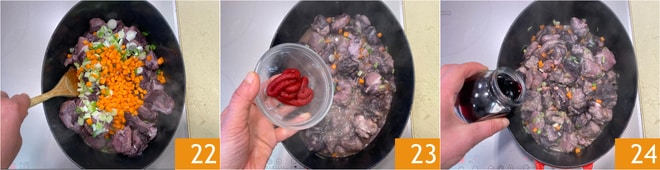 Braten Sie es ein paar Minuten an 22, dann würzen Sie mit Tomatenmark 23 und rühren Sie, um es zu mischen. Löschen Sie mit Rotwein ab 24 und lassen Sie den Alkohol vollständig verdampfen.