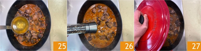 Bedecken Sie mit der Gemüsebrühe 25, würzen Sie mit Salz und Pfeffer 26, decken Sie mit einem Deckel ab 27 und lassen Sie es 2,5 Stunden bei schwacher Hitze köcheln.