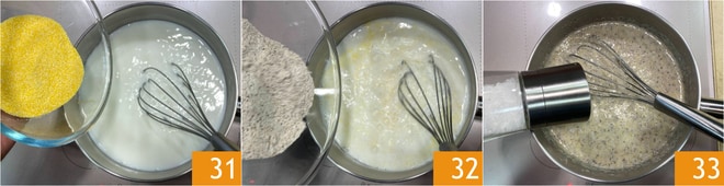Am Ende der Garzeit schalten Sie die Hitze aus und fügen den ungesüßten Kakao hinzu 28, gut umrühren, um alles zu vermengen. Bereiten Sie die Taragna-Polenta vor: Gießen Sie das Wasser 29 und die Milch 30 in einen kleinen Topf und bringen Sie es zum Kochen.