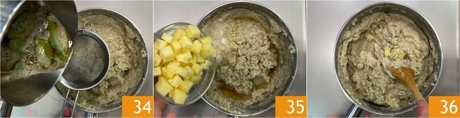 Nach dem Kochen schalten Sie die Hitze aus und rühren Sie mit der aromatisierten geschmolzenen Butter 34 und den Käsewürfeln 35 um. Gut rühren, um den Käse zu schmelzen und eine homogene Konsistenz zu erreichen 36.