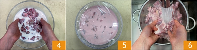 Um das Wildschweineintopf mit Taragna-Polenta zuzubereiten, schneiden Sie zuerst das Wildschweinfleisch in Würfel von etwa 3 cm 1. Geben Sie sie in eine Schüssel, gießen Sie die Milch 2 ein und fügen Sie das Natron 3 hinzu; stellen Sie sicher, dass das Fleisch vollständig mit der Flüssigkeit bedeckt ist.