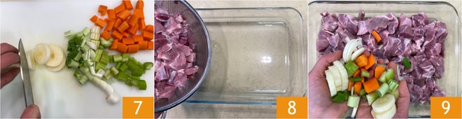 Legen Sie das Fleisch vorübergehend in ein Sieb und bereiten Sie die zweite Marinade vor: schälen und grob schneiden Sie die Karotte, den Sellerie, die Frühlingszwiebel und den Lauch 7. Geben Sie das Wildschweinfleisch in einen flachen, breiten Behälter 8 und verteilen Sie das Gemüse darüber 9.