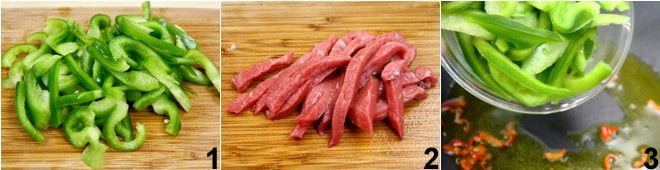 Um das würzige Rindfleisch vorzubereiten, beginnen Sie damit, eine Paprika zu waschen, halbieren Sie sie, entfernen Sie den Stiel und die Samen und schneiden Sie sie in ziemlich dünne Streifen 1. Schneiden Sie auch das Fleisch in etwa 1 cm breite 2 und 5 cm lange Streifen. Zerkleinern Sie dann die beiden Chilischoten, die Sie halbiert haben, um die inneren Samen zu entfernen. Erhitzen Sie Öl und Chilischoten in einem Wok und geben Sie die Paprikastreifen hinzu 3, salzen und pfeffern Sie und kochen Sie sie etwa 10/15 Minuten lang.
