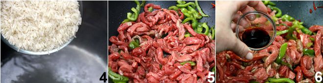 In der Zwischenzeit können Sie einen Topf Wasser zum Kochen bringen und anschließend den Basmati-Reis hineingeben 4. Nach der Garzeit der Paprika fügen Sie die Rindfleischstreifen hinzu 5, braten Sie sie an, bis sie durchgegart sind, und würzen Sie mit 6 Esslöffeln Sojasauce 6.