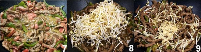 Vermischen Sie dann alles sorgfältig, ohne die Paprika zu zerbrechen 7. Sobald das Rindfleisch gar ist, nehmen Sie den Wok vom Herd, fügen Sie den gehackten Schnittlauch 8 und die Sojasprossen 9 hinzu, mischen Sie alles und lassen Sie den Basmati-Reis abtropfen. Servieren Sie das würzige Rindfleisch mit dem Reis und fügen Sie bei Bedarf mehr Sojasauce hinzu. Um das würzige Rindfleisch mit Basmati-Reis zu bereichern, können Sie einen Esslöffel Sesam hinzufügen, den Sie geröstet haben, um sein Aroma freizusetzen.