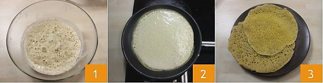 Um das Zighinì vorzubereiten, beginnen Sie mit dem Injera-Brot, das zwei Tage zur Fermentation benötigt: Das detaillierte Rezept finden Sie, indem Sie hier klicken (Injera-Brot). Mischen Sie in einer großen Schüssel die drei Mehle; lösen Sie die Trockenhefe in 250 ml lauwarmem Wasser auf (alternativ können Sie 6 g frische Hefe verwenden) und gießen Sie die Flüssigkeit nach und nach über die Mehle. Mischen Sie kräftig mit einem Schneebesen, um einen dicken, weichen und homogenen Teig zu erhalten, den Sie mit Frischhaltefolie abdecken und 2 Tage bei Raumtemperatur stehen lassen. Nach 2 Tagen fügen Sie der Mischung 150 ml kochendes Wasser und das Natron hinzu; mischen Sie erneut mit dem Schneebesen und decken Sie alles wieder mit der Folie ab, lassen Sie es dann noch eine Stunde ruhen, nach der die Mischung aufgeblasen und voller Blasen erscheinen wird 1. Um das Brot zu backen, verwenden Sie eine runde, antihaftbeschichtete Pfanne: Erhitzen Sie sie sehr gut und geben Sie etwa 70 g Mischung darauf. Sobald Blasen auf der Oberfläche erscheinen 2, decken Sie sie mit einem Deckel ab und beenden Sie das Backen: Dies dauert etwa 2 Minuten, Sie werden bemerken, dass das Backen beendet ist, da das Brot seine Farbe ändert 3. Sobald es gebacken ist, decken Sie das Brot sehr gut mit Frischhaltefolie ab, um zu verhindern, dass es austrocknet.