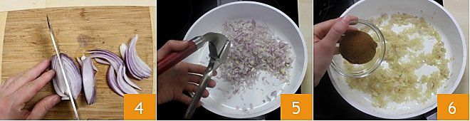 Bereiten Sie nun das Gulasch vor: Schneiden und hacken Sie die Zwiebeln fein 4 und geben Sie sie mit einem Schuss Öl zusammen mit den zerdrückten Knoblauchzehen in die Pfanne 5. Braten Sie alles bei mittlerer Hitze an, dann fügen Sie das Berberè hinzu 6 und lassen es für einige Minuten würzen.