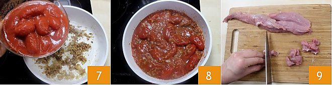 Fügen Sie auch die Tomaten hinzu 7, salzen Sie bei Bedarf und lassen Sie es bei niedriger Hitze etwa zehn Minuten kochen 8. In der Zwischenzeit schneiden Sie das Rindfleisch 9 in Stücke von etwa 1 cm (versuchen Sie, sie so gleichmäßig wie möglich zu schneiden, um ein gleichmäßiges Garen zu gewährleisten).