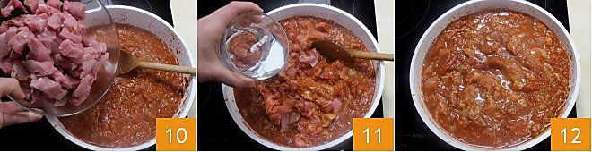 Fügen Sie das Fleisch der Sauce direkt in der Pfanne hinzu 10, mischen Sie und lassen Sie es mit einem Deckel etwa 2 Stunden kochen, gelegentlich umrühren und lauwarmes Wasser hinzufügen, wenn die Sauce zu trocken wird 11. Nach zwei Stunden sollte das Fleisch zart sein und die Sauce dick, aber nicht trocken 12; wenn dies nicht der Fall ist, fügen Sie Wasser hinzu und lassen Sie es noch 10-20 Minuten kochen. Kurz vor Ende der Garzeit mit Salz abschmecken.