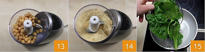 Bereiten Sie die Beilage für das Gulasch vor: Pürieren Sie in einem Mixer die vorgekochten Kichererbsen mit einem Schuss Öl, Salz und Pfeffer nach Geschmack (13-14). Braten Sie den gewaschenen Spinat mit einem Schuss Öl ein paar Minuten in der Pfanne und salzen Sie ihn 15. Sie können die anderen Hülsenfrüchte naturbelassen oder mit Öl, Petersilie, Salz und Pfeffer nach Geschmack würzen. Waschen Sie den Salat; waschen und vierteln Sie die Tomaten.