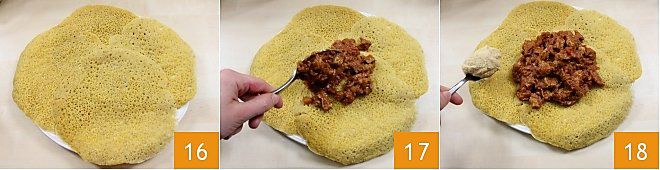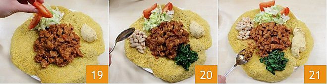 Sobald das Fleisch fertig ist, können Sie das Zighinì zusammenstellen: Bereiten Sie einen großen Teller (möglichst flach) für je 3-4 Personen vor, indem Sie darauf 3-4 Injera übereinanderlegen 16 und in die Mitte ein paar große Löffel Gulasch geben 17. Um das Fleisch herum arrangieren Sie das Gemüse und die Hülsenfrüchte: ein Löffel Kichererbsencreme 18,