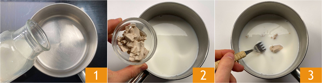 Um die Cinnamon Rolls zuzubereiten, geben Sie zuerst die Milch 1 und das Wasser in einen kleinen Topf und erhitzen Sie sie auf 35°. Nehmen Sie den Topf vom Herd und fügen Sie die zerbröckelte frische Hefe hinzu 2, dann rühren Sie um, bis sie vollständig aufgelöst ist 3.