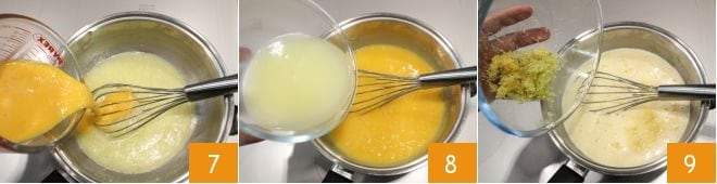und in die Creme gießen 7 und dabei weiter rühren, fügen Sie auch den Zitronensaft hinzu, in dem Sie die Maisstärke aufgelöst haben 8, die abgeriebene Zitronenschale 9 und fahren Sie fort, die Creme unter ständigem Rühren bei schwacher Hitze zu verdicken, halten Sie die Hitze sehr niedrig und lassen Sie nur das Wasser des Wasserbades sieden, um zu vermeiden, dass das Ei gerinnt; die Creme darf niemals kochen.