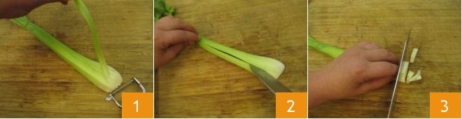 Um die Acquasale zuzubereiten, waschen Sie als Erstes alle Gemüse; dann kümmern Sie sich um den Sellerie. Verwenden Sie einen Gemüseschäler, um die äußeren Fasern zu entfernen 1, und schneiden Sie ihn mit einem Messer der Länge nach in der Mitte ein 2. Schneiden Sie ihn schließlich in Streifen von etwa einem halben Zentimeter Dicke 3.