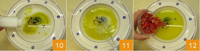 Fügen Sie auch eine Prise Salz hinzu 10 und vermischen Sie alles mit einem Schneebesen 11. Geben Sie die Cherrytomaten hinein 12,