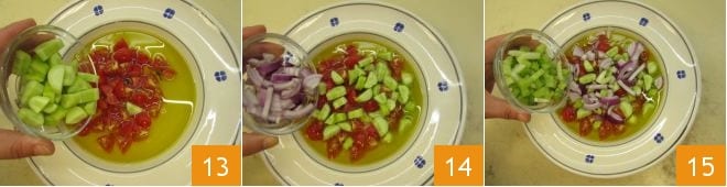 die Gurken 13, die Zwiebel 14 und zuletzt den Sellerie 15.