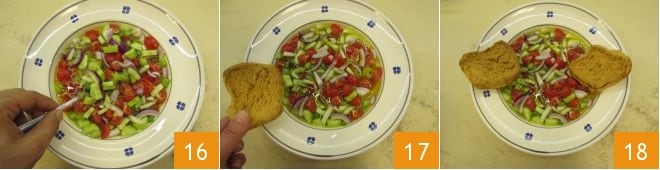 Alles mit einem Löffel mischen 16, die Friselle um den Teller legen 17 und die Acquasale servieren 18!