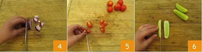 Kommen wir zur Zwiebel, schneiden Sie auch diese in Streifen der gleichen Dicke 4 und legen Sie sie beiseite. Nehmen Sie die Cherrytomaten und vierteln Sie sie, teilen Sie dann jedes Viertel in der Mitte, um 8 Stücke aus jeder Tomate zu erhalten. Zuletzt kümmern Sie sich um die weißen Gurken, es wird nicht notwendig sein, sie zu schälen; teilen Sie sie zuerst der Länge nach in der Mitte 6