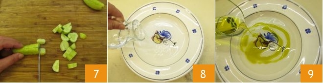 und schneiden Sie dann Halbmonden von etwa einem halben Zentimeter Dicke 7. Nun, da alle Gemüse geschnitten sind, nehmen Sie einen ziemlich großen tiefen Teller, in den Sie zuerst das Wasser 8 und dann das Öl 9 gießen.
