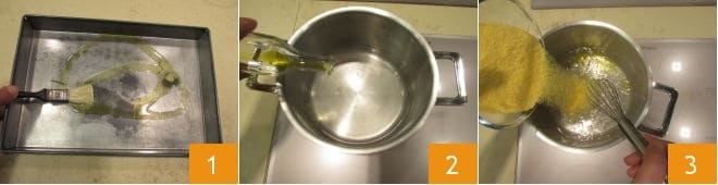 Um das Amuse-Bouche aus Polenta und Jakobsmuschel vorzubereiten, geben Sie zunächst 5 g Öl in eine Backform mit einem Durchmesser von 28x20 cm und stellen Sie sie beiseite 1. In der Zwischenzeit bringen Sie einen Topf mit Wasser zum Kochen. Sobald es kocht, salzen Sie es und fügen etwa 10 g Öl hinzu 2, dann lassen Sie den Instant-Polenta-Grieß einrieseln und rühren kräftig mit einem Schneebesen (oder einem Holzlöffel), um Klumpen zu vermeiden 3.