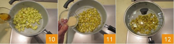 Salzen und pfeffern Sie und kochen Sie sie für 3-4 Minuten bei hoher Hitze, löschen Sie sie mit Brandy ab und lassen Sie ihn verdampfen (achten Sie auf mögliche Flammen!) 10. Fügen Sie den Rohrzucker hinzu und lassen Sie ihn einige Minuten karamellisieren 11; zu diesem Zeitpunkt sind die Äpfel fertig, decken Sie sie mit einem Deckel ab und stellen Sie sie beiseite 12.
