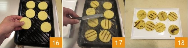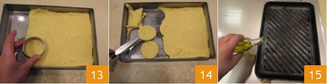 Holen Sie die Polenta zurück und schneiden Sie mit einem Ausstecher von 6,5 cm Durchmesser 13 8 Scheiben aus 14. Erhitzen Sie einen Grill und beträufeln Sie ihn mit 10 g Öl 15,