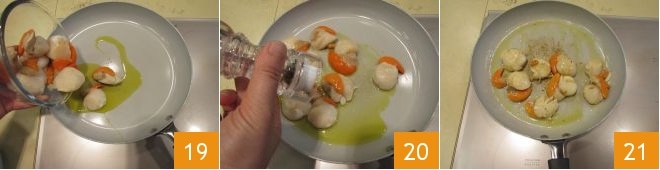 Zum Schluss braten Sie auch die Jakobsmuscheln. Erhitzen Sie eine Pfanne mit dem restlichen Öl und geben Sie die Muscheln hinzu, braten Sie sie 2 Minuten auf jeder Seite bei mittlerer bis hoher Hitze 19, würzen Sie mit Salz und weißem Pfeffer 20 und schwenken Sie häufig, damit sie nicht kleben bleiben 21.