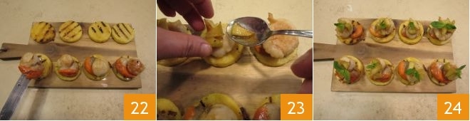 Gehen Sie schließlich zur Anrichtung über: Legen Sie die Polenta-Scheiben auf ein Brett, platzieren Sie die Jakobsmuscheln 22 und dann die Äpfel 23. Zum Schluss garnieren Sie Ihre Amuse-Bouche mit ein paar Minzblättern und Sie sind bereit, Ihre Gäste zu überraschen 24!