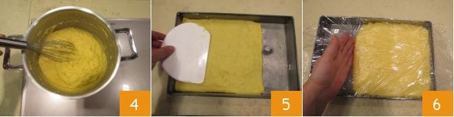 Rühren Sie weiter kontinuierlich für 8 Minuten, um eine feste und trockene Polenta zu erhalten 4. Geben Sie dann die Polenta auf ein Tablett und glätten Sie sie mit einem Spatel, bis sie eine Dicke von 0,5 cm erreicht hat, ohne sie über die gesamte Fläche zu verteilen 5. Decken Sie sie mit Frischhaltefolie ab und lassen Sie sie 20 Minuten im Kühlschrank abkühlen 6.