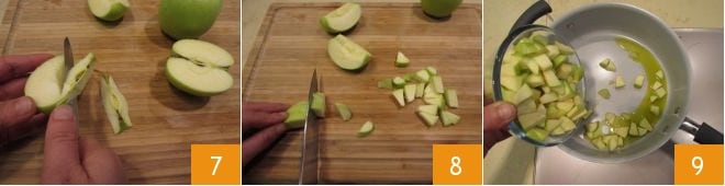 In der Zwischenzeit kümmern Sie sich um die Äpfel. Schneiden Sie sie in 4 Teile und entfernen Sie das Kerngehäuse 7, schneiden Sie sie in Stückchen von etwa zwei Zentimetern und sammeln Sie sie in einem Behälter 8. Erhitzen Sie 20 g Öl in einer Pfanne und geben Sie dann die Äpfel hinzu 9.