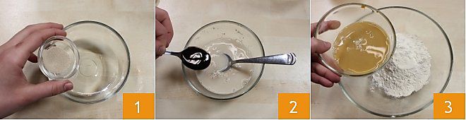 Um die salzige Bier-Angelika zuzubereiten, bereiten Sie zuerst das Vorteig vor: Geben Sie die Trockenhefe (alternativ können Sie 12 g frische Hefe verwenden) in das lauwarme Wasser und lösen Sie sie durch Rühren mit einem Teelöffel auf 1; fügen Sie dann das Gerstenmalz (oder den Zucker) hinzu 2 und lösen Sie es ebenfalls durch Rühren auf. Sieben Sie das Mehl in eine Schüssel, fügen Sie die Hefe-Malz-Mischung hinzu 3 und vermengen Sie alle Zutaten, bis sie gut vermischt sind.