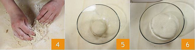 Geben Sie den Teig auf eine bemehlte Arbeitsfläche und kneten Sie ihn, bis er eine glatte und homogene Kugel bildet, die Ihr Vorteig ist 4. Legen Sie den Vorteig in eine Schüssel, decken Sie die Schüssel mit Frischhaltefolie ab 5 und lassen Sie ihn eine Stunde im ausgeschalteten Ofen bei eingeschaltetem Licht gehen, bis er sein Volumen verdoppelt hat 6.