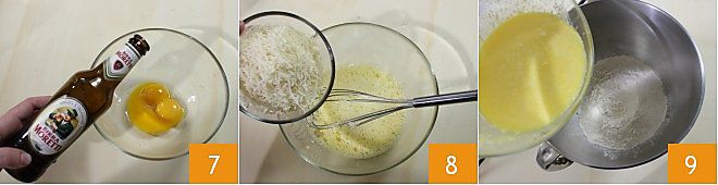 Schlagen Sie die Eier in einer Schüssel zusammen mit dem Bier 7, fügen Sie dann den Parmesankäse 8 und das Salz hinzu und mischen Sie alles. Nehmen Sie eine Küchenmaschine mit einem Flachrührer und geben Sie das gesiebte Mehl hinein, geben Sie die Eiermischung in die Küchenmaschine 9 (wenn Sie keine Küchenmaschine haben, geben Sie die Zutaten in eine Schüssel und kneten Sie von Hand).