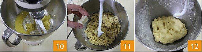 Kneten Sie mit dem Flachrührer, bis alle Zutaten vermischt sind 10. Entfernen Sie den Flachrührer und setzen Sie den Knethaken ein, beginnen Sie dann, die Stücke von weicher Butter nach und nach hinzuzufügen, wobei Sie dem Teig Zeit geben, sie aufzunehmen 11. Kneten Sie weiter, bis die Butter vollständig eingearbeitet ist und der Teig homogen ist 12.