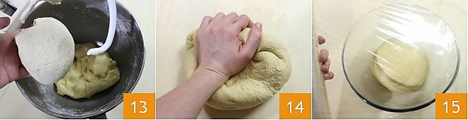 Fügen Sie dem Teig nun den Vorteig 13 stückweise hinzu und kneten Sie weiter mit dem Knethaken, bis der Vorteig vollständig eingearbeitet ist. Geben Sie den Teig auf eine bemehlte Arbeitsfläche und bearbeiten Sie ihn 14, bis er eine glatte und homogene Kugel bildet. Legen Sie den Teig in eine Schüssel und decken Sie ihn mit Frischhaltefolie ab 15; lassen Sie ihn im ausgeschalteten Ofen bei eingeschaltetem Licht 2 Stunden gehen.