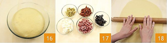 bis der Teig sein Volumen verdoppelt hat 16. Bereiten Sie nun die Füllung der Angelika vor: Schneiden Sie die grünen und schwarzen Oliven in Scheiben, den Salami und den Feta in gleichmäßige Würfel und die getrockneten Tomaten in Stücke 17. Nehmen Sie den aufgegangenen Teig und rollen Sie ihn mit einem Nudelholz auf eine Dicke von einem halben Zentimeter aus, um ein rechteckiges Blatt zu erhalten 18.