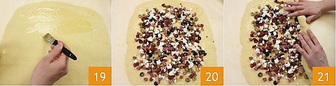 Bestreichen Sie das Teigblatt mit Olivenöl extra vergine 19 und bestreuen Sie es mit den zuvor vorbereiteten Zutaten: Salami, schwarze Oliven, grüne Oliven, getrocknete Tomaten und Feta 20. Beginnen Sie, das Blatt von der längsten Seite her aufzurollen und ziehen Sie es dabei möglichst fest, damit die Füllung nicht herauskommt 21.