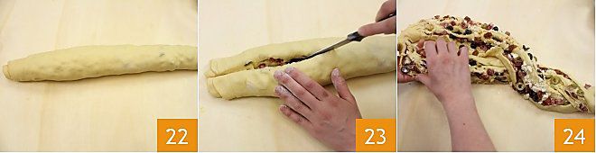 Rollen Sie weiter, bis Sie eine Rolle erhalten 22. Schneiden Sie die Rolle mit einem scharfen und bemehlten Messer in der Mitte durch 23, sodass die beiden Teile getrennt und miteinander verflochten werden können, wobei darauf zu achten ist, dass der geschnittene Teil oben bleibt, damit die Abschnitte und die Füllung sichtbar sind 24.