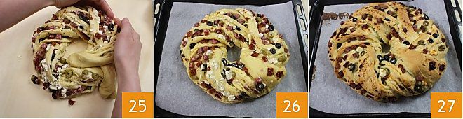 Formen Sie aus dem Zopf einen Kranz und verbinden Sie die beiden Enden, indem Sie sie überlappen 25, legen Sie die Angelika auf ein mit Backpapier ausgelegtes Backblech 26 und lassen Sie sie 30 Minuten im ausgeschalteten Ofen bei eingeschaltetem Licht gehen, bis sie ihr Volumen verdoppelt hat. Nach den 30 Minuten backen Sie die Bier-Angelika in einem auf 180°C vorgeheizten statischen Ofen für 35 Minuten (oder im Umluftofen bei 160°C für 25 Minuten). Wenn die Oberfläche goldbraun ist, nehmen Sie die salzige Bier-Angelika aus dem Ofen 27 und lassen Sie sie etwas abkühlen, bevor Sie sie servieren.