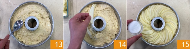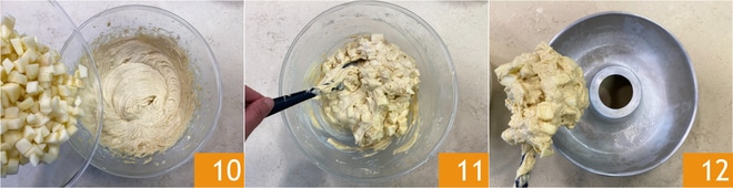 Fügen Sie die Apfelwürfel hinzu 10 und rühren Sie um 11. Geben Sie die gesamte Mischung in eine zuvor gefettete Kranzkuchenform von 22 cm Durchmesser und 7 cm Höhe 12.