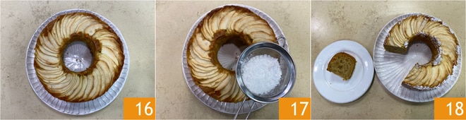Backen Sie im statischen Ofen, auf mittlerer Schiene, bei 180°C für 60 Minuten, machen Sie die Stäbchenprobe, um die Garung zu überprüfen, bevor Sie den Kuchen herausnehmen. Lassen Sie ihn abkühlen, stürzen Sie ihn dann auf eine Servierplatte 16 und bestäuben Sie ihn mit Puderzucker 17. Ihr Apfelkuchen ist nun bereit zum Servieren 18.