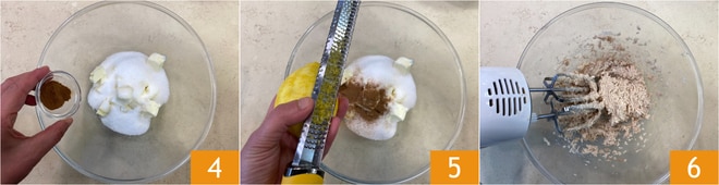 Fügen Sie den Zimt 4 und die Zitronenschale 5 hinzu und schlagen Sie alles mit einem elektrischen Mixer, bis Sie eine weiche, leicht schaumige Creme erhalten 6.